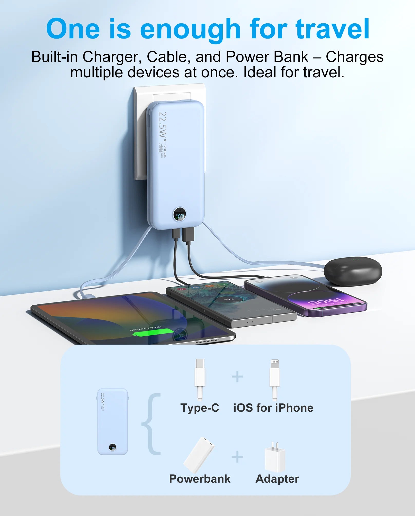 - Built-in Cables: Enjoy hassle-free charging with built-in Lightning and Type-C cables, eliminating the need to carry multiple cords.